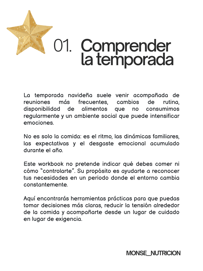 Este workbook te guía paso a paso para entender cómo te sientes, qué necesitas y cómo quieres relacionarte con la comida durante las fiestas, desde un enfoque profesional, realista y libre de culpa. No te dice qué comer ni busca “controlar” tus decisiones; te acompaña a reconocer tus señales internas, manejar la presión social y sostenerte emocionalmente en un mes que suele estar cargado.